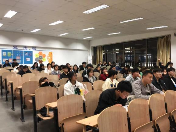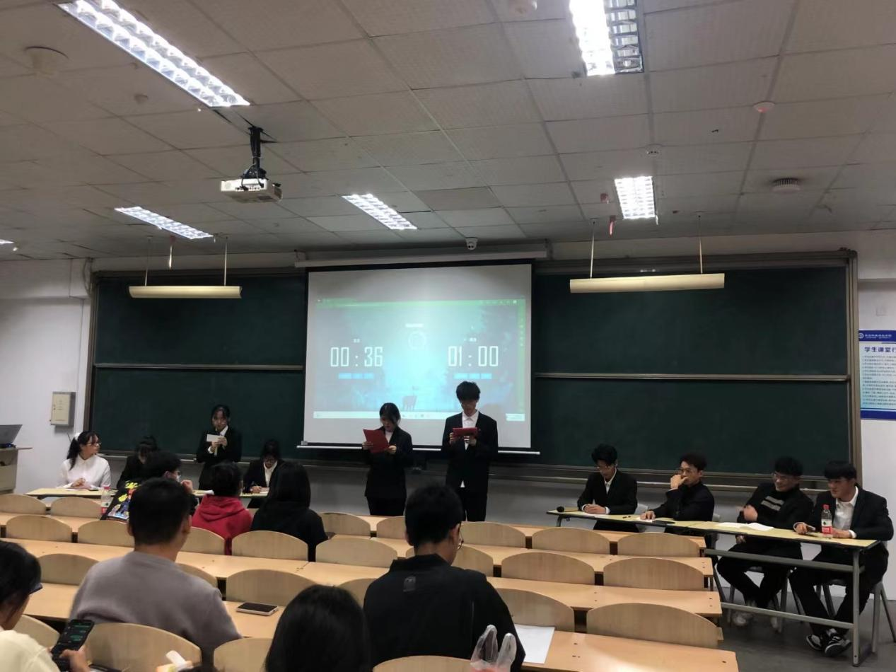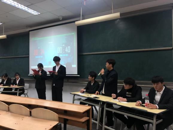 在主持人开场及介绍规则后,比赛开始。场上的气氛瞬间焦灼了起来,双方辩手口若悬河,侃侃而谈。在他们的淡定且自信的面容中,仿佛在说出胜利的语言,展示出必胜的决心。他们运用所持有的论据稳固着己方的论点,同时又用雄鹰般的眼神寻找着对方的漏洞。台下观赛的同学们看得激情澎湃,现场时不时想起雷鸣般的掌声。
